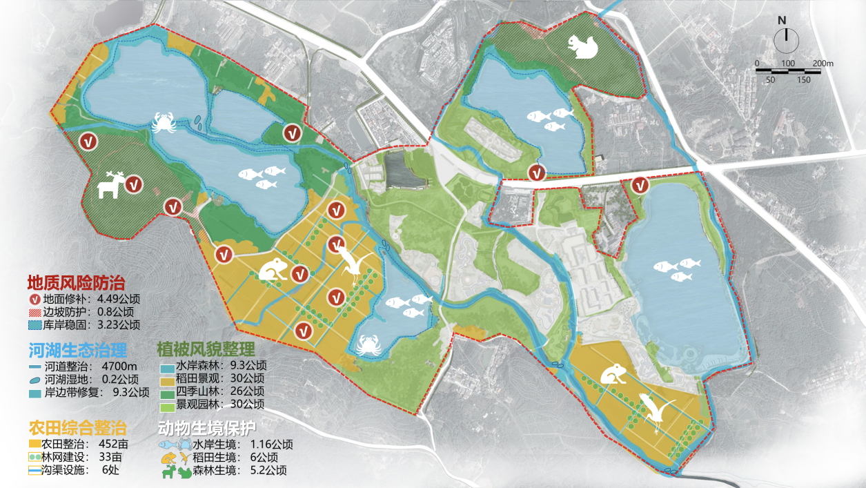 生态修复方案基于“山水林田湖草”生命共同体理念,依据灾害与风险、生态系统与景观风貌两类评价,从“地质灾害和洪涝灾害”源头出发,制定了地质风险防治、河湖生态治理、农田综合整治、植被风貌整理、动物生境保护 “五步走”生态修复策略,形成144公顷的“山水林田湖草” 源头修复、综合治理一张图。通过回填土、筏板基础填补地陷坑洞、石笼+固土地被防治滑坡等施工措施,原本有风险的矿坑周边土地安全隐患得以消除;通过河道拓宽与矿湖连通,提高了区域行洪调蓄能力;以乡土榕树为基调,水生植物软化岸线,营造了水清岸绿的多层次森林群落。