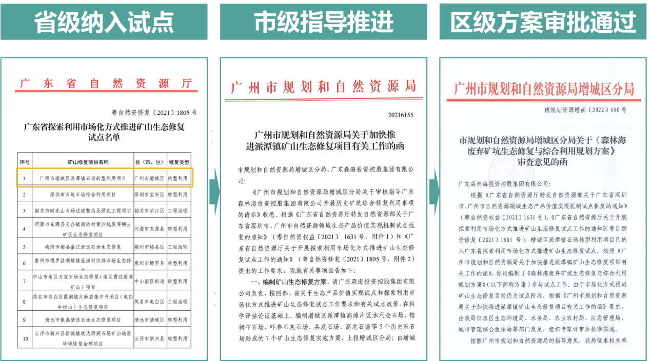 2019年后,贯彻落实自然资源部《关于探索利用市场化方式推进矿山生态修复的意见》,广东省出台《广东省自然资源厅关于开展探索利用市场化方式推进矿山生态修复试点工作的通知》,将森林海废弃矿坑群纳入了广东省十个探索利用市场化方式推进矿山生态修复试点之一。以此为契机,地方政府引入了广东省森海投资控股集团对6个废弃矿坑开展进一步的生态修复与综合利用,集团委托广州市城市规划勘测设计研究院编制技术方案,指导一系列治理与盘活,市场化推进废弃矿坑生态修复创造了明显的生态修复成效与生态产品价值,目前,废弃矿坑修复和利用后,已被列为广东省省级旅游度假区、乡村振兴示范点,广州自然资源领域生态产品价值实现机制试点。