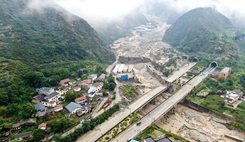 图为四川地矿局402队蜀西勘测院技术人员用无人机拍摄的汶川县板子沟灾害现场。陈 韬 摄