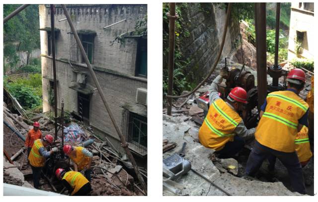 情发生后,作为两江新区地灾驻守技术支撑单位的重庆市地勘局107地质队迅速成立应急抢险指挥部,第一时间奔赴现场开展应急抢险工作。抢险小组到达现场时,斜坡前缘堡坎变形丝毫没有停下的迹象,地面产生多条平行于堡坎走向的裂缝。此时,抢险小组的工作效率与堡坎变形速度进行着百米赛跑。经过现场仔细踏勘,果断撤离9户25人,并对圈定危险区实行封闭。