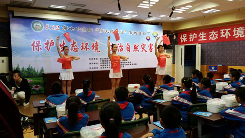 11日主场宣传活动在北京丰台第五小学举行,为了增加孩子们的记忆我们特别组织编排了“逃生歌”等文艺演出。将防灾减灾的宣传在寓教于乐中进行。