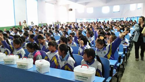 8日-9日宣传活动组来到湖北省秭归县三峡希望工程小学,进行防灾疏散演练和防震减灾系列教育,向参加演练的1300多名师生、家长赠送防灾知识手册和医疗急救包,学校利用类似灯谜有奖回答方式让孩子互动回答问题。