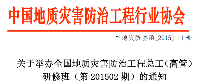 为满足国内地质灾害防治工程行业高级专业技术人员和高层管理人员对行业前沿理论和技术发展、国家相关行业政策法规方面的需求,推动地质灾害治理新理论、新技术的推广应用,由中国地质灾害防治工程行业协会主办、中国地质大学(北京)承办的地质灾害防治工程总工(高管)研修班(第201502期)将在北京举办。现将培训有关事项通知如下: