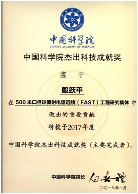据悉,中国科学院杰出科技成就奖授予院属单位在近五年内完成或显示影响的重大成果的个人或集体,每两年评选一次,每次授奖总数不超过10个。获奖者由中国科学院院长签署奖励证书并颁发奖章或奖杯。殷跃平为“500米口径球面射电望远镜(FAST)工程研究集体”中唯一的中国科学院院外获奖专家。