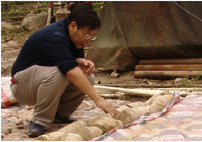 照片2 殷跃平在大窝凼洼地现场察看钻孔岩心