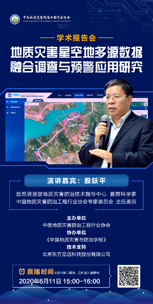 由中国地质灾害防治工程行业协会主办的全国防灾减灾日云服务公益活动--地质灾害星空地多源数据融合调查与预警应用研究学术报告会(以下简称 “报告会”),定于6月11日15-16时通过视频直播形式举行。报告会邀请自然资源部地质灾害防治技术指导中心首席科学家、中国地质灾害防治工程行业协会专家委员会主任委员殷跃平研究员,就无人机、雷达卫星、北斗导航定位系统、航空物探等先进技术在地质灾害监测预警中的融合方式、发挥作用等做主题演讲,欢迎广大会员单位组织相关人员和社会公众积极参与。