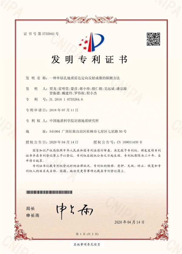 近日,自然资源部中国地质调查局岩溶地质研究所岩溶塌陷研究所团队又获1项国家发明专利,即“一种单钻孔地质雷达定向反射成像的探测方法”(专利号:2018 1 0755264.6)。