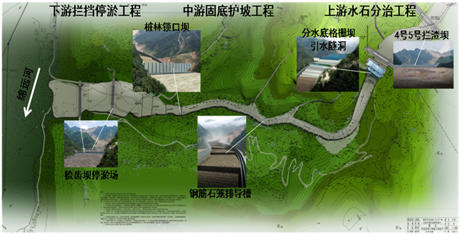 文家沟泥石流的成灾机理模型为“两源分离、集中堵溃、集中放大”型,因此,治理工程采取“固、拦、排、停”相结合的综合治理方案,针对泥石流形成要素的“水源”、“物源”采取“上游水石分治、中游固底护坡、下游拦挡停淤”的分级治理措施,达到从源头上控制泥石流的目的。即以分水工程将上游主要水源通过一号支沟引离中游的巨大物源区,导入绵远河,切断水源与物源结合的可能性;对中游松散的巨大物源区采用钢筋块片石砌体的软性方式固坡护底,不让其启动;在下游沟口区设拦挡停淤工程,将上游仍可能冲出的固体物源停积在预定区域,同时全程辅以监测维护。