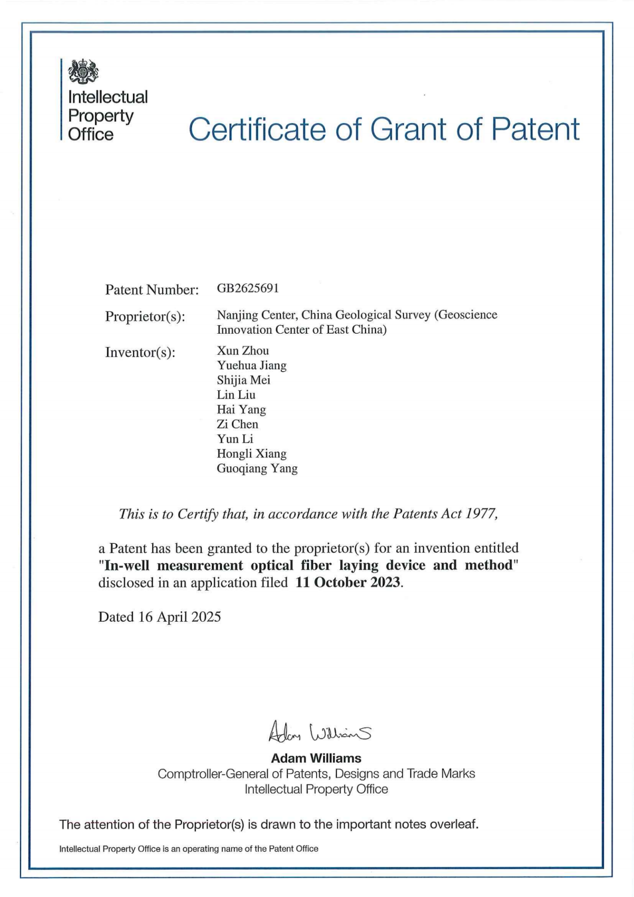 南京地调中心“井中测量光纤布设装置及方法”获英国发明专利授权