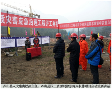 2014年1月25日,在双石镇石凤村黑水堰泥石流地质灾害治理工程点举行了芦山地质灾害应急治理施工项目的集中启动仪式。芦山县人大康贵松副主任、芦山县国土资源局徐崇辉局长、高光强副局长,陆源公司胡海军总经理、陆源公司李正聪副总经理以及其他施工单位、设计单位相关人员参加集中启动仪式。