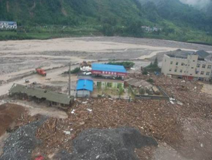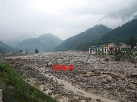 照片1 文家沟泥石流淤埋民房 照片2 文家沟泥石流堵断绵远河
